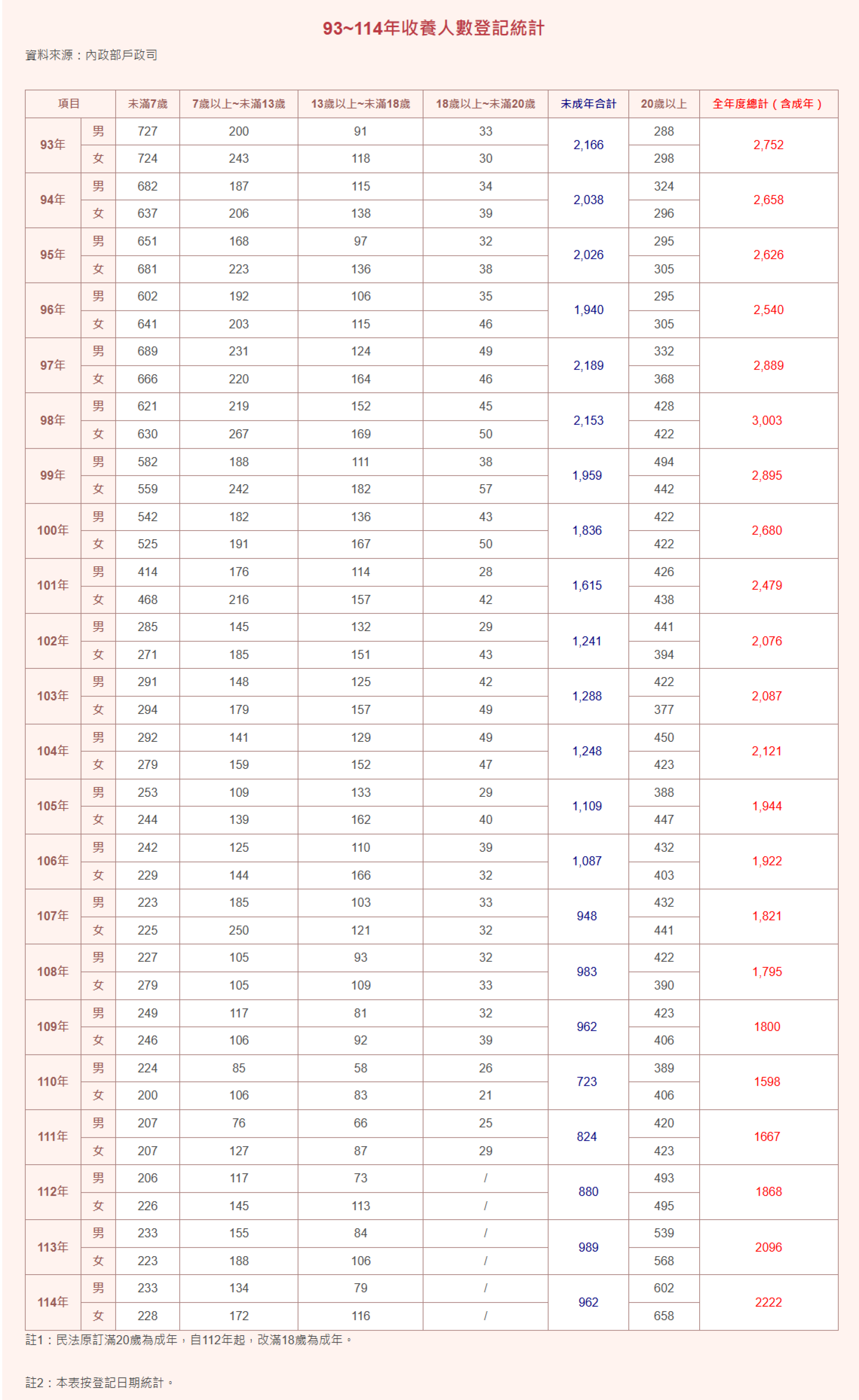 98年-114年收養人數登記統計表
